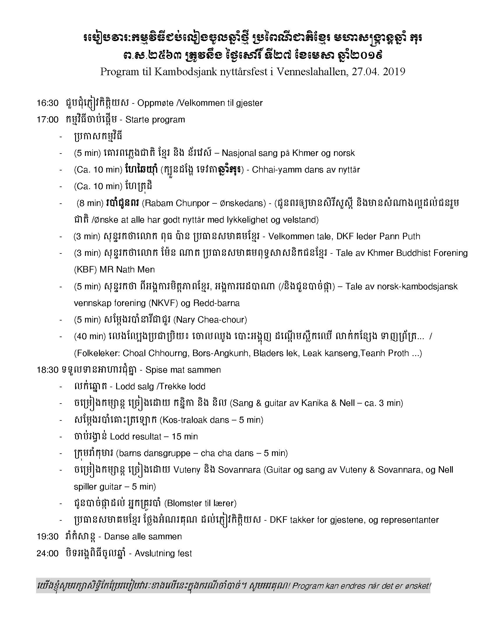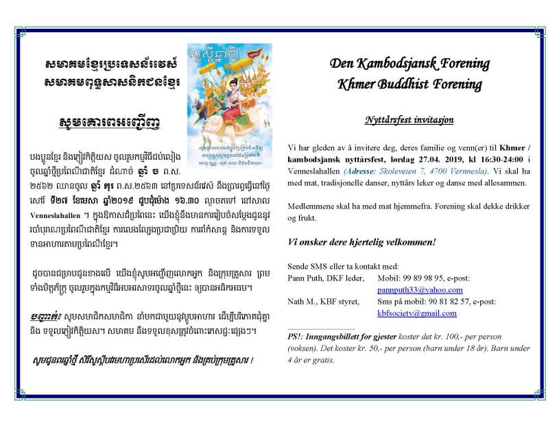 This is invitation letter for Khmer /Cambodia New Year Party which will held in Vennesla Hall, Vennesla commune, Vest-Agder, South Norway. The letter has written in Khmer and Norwegian.